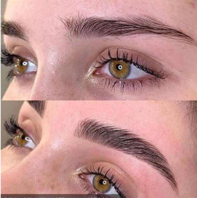 Eyebrow lamination involves setting hairs in the same direction using a solution to make them straight.